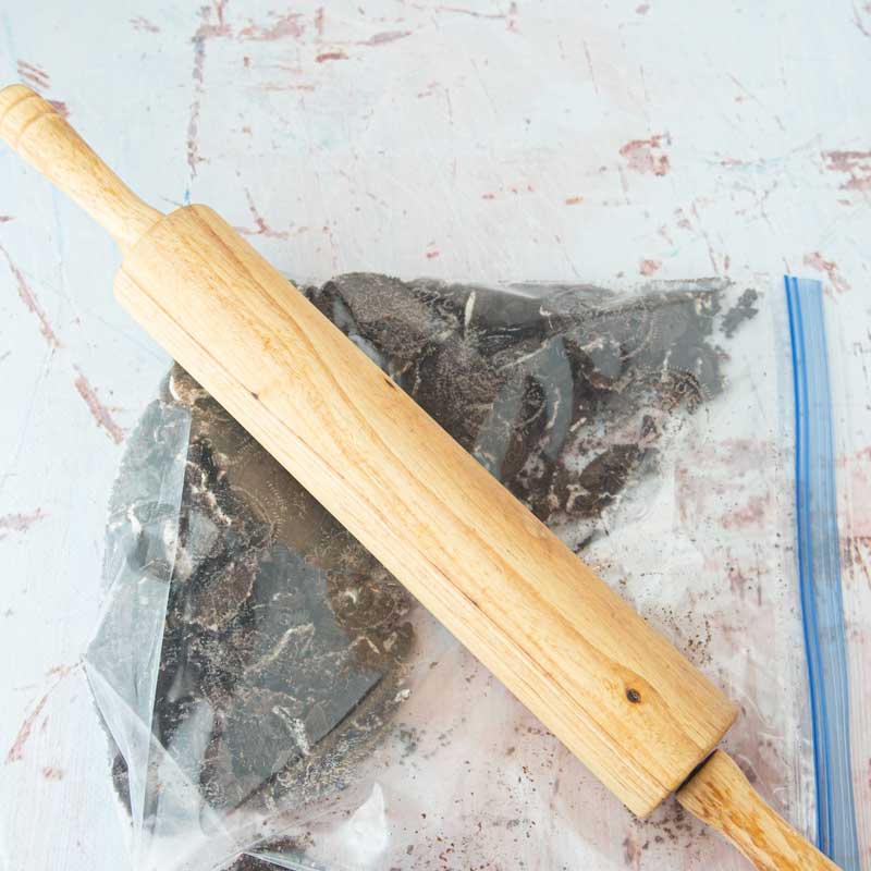 - Bash the Oreos: don’t bother chopping perfect pieces. Oreos are meant to be erratically crushed. Put them in a plastic bag and grab a rolling pin to smash them. The uneven pieces will make your cookies interesting.
