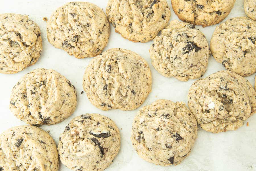- Towards the end of the chilling time, preheat the oven to 350 F (180 C). Line sheet trays with parchment (you’ll need 5 as this makes 30 cookies, but if you have at least 3 sheet trays, the first batch will be done cooling by the time you get to them).