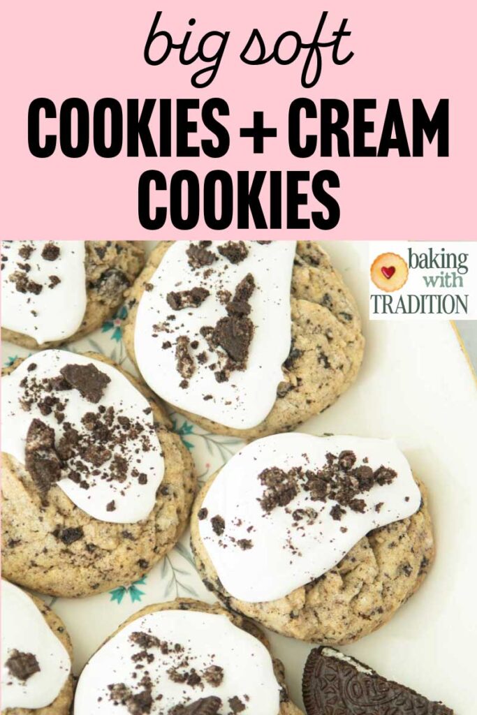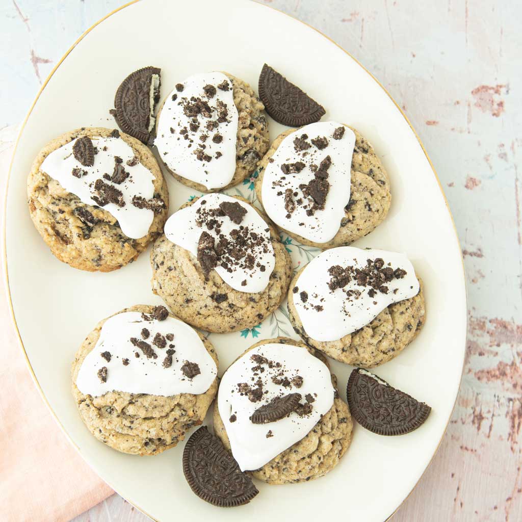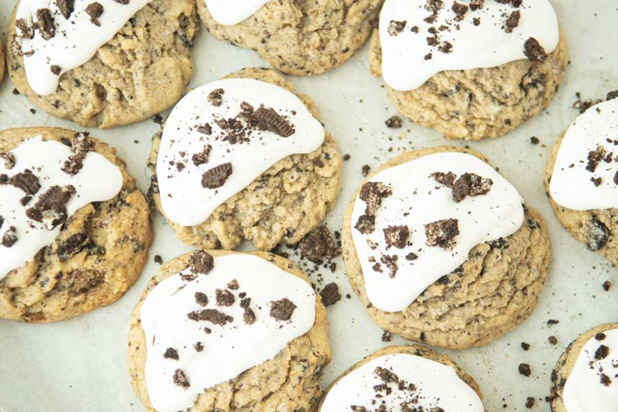 Big soft sugar cookies with brown sugar and crushed Oreos topped with glossy marshmallow cream frosting. These cookies are here to party.