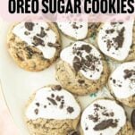 Big soft sugar cookies with brown sugar and crushed Oreos topped with glossy marshmallow cream frosting. These cookies are here to party.