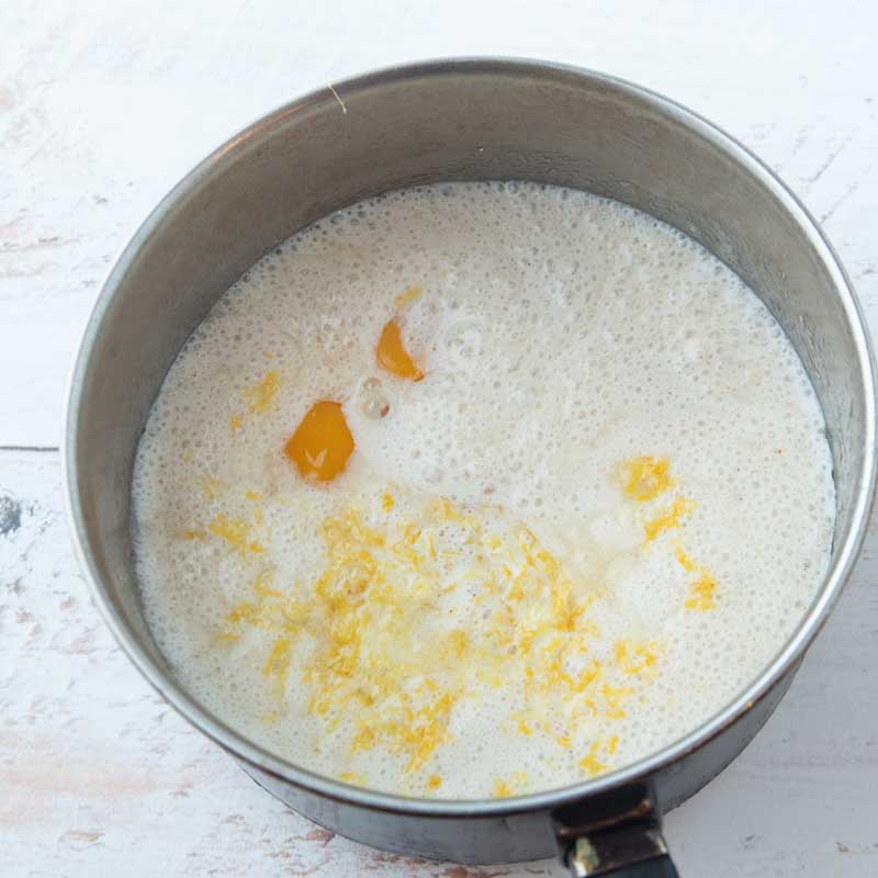 - Add in the rum, lemon zest, vanilla paste, egg yolks and whisk.