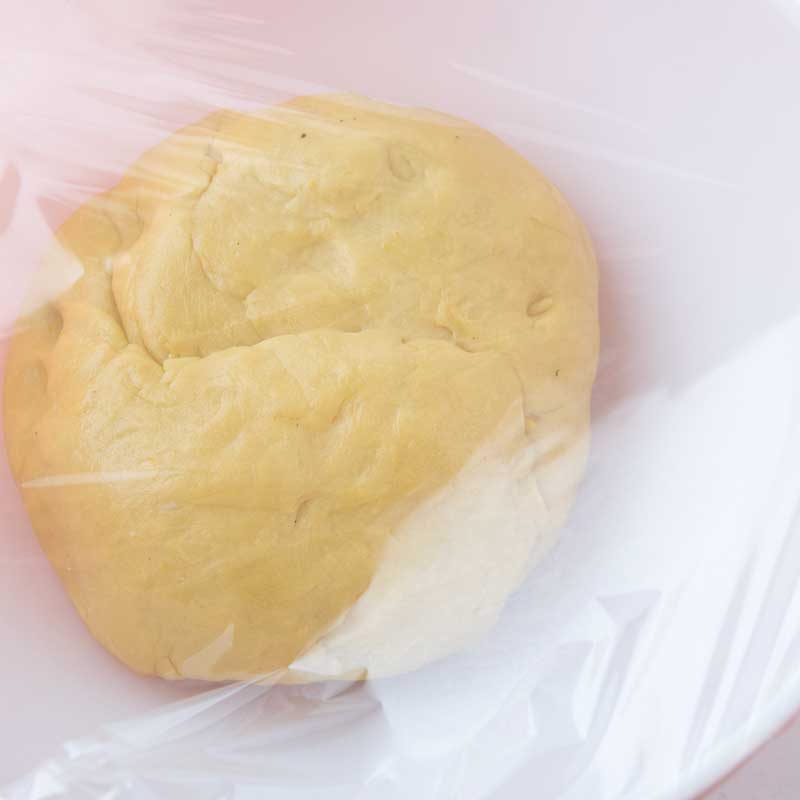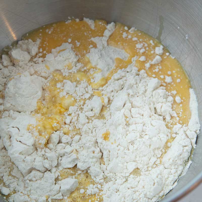 - Pour the yeast/milk mixture into mixer bowl. Add in the flour and salt. Knead the dough until smooth either by hand or with a dough hook for about 5 minutes in a stand mixer.