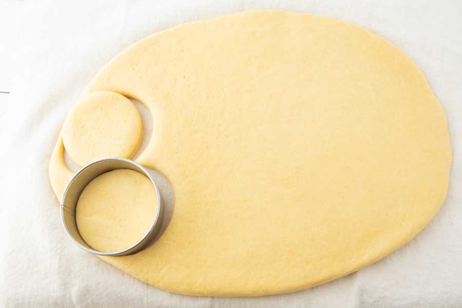 - Cut: Cut out rounds of dough with a 3″ biscuit cutter. Gently press the scraps together. Let the scraps sit before cutting more rounds of dough. Any scraps beyond that can be twisted and fried into unusual shapes.