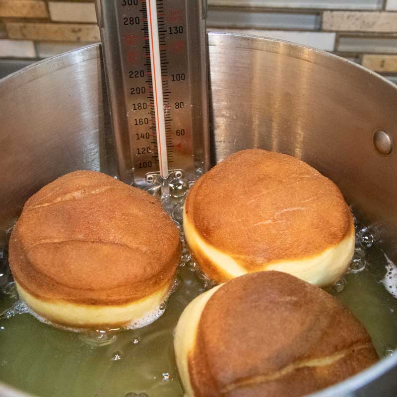 - Monitor the oil temperature: I’ve made many batches of paczki fried at 350 F, and 370 F makes for superior donuts. Watch your candy thermometer during cooking: If your oil rises too high or low between or during batches, take the pot off the heat (too hot) or raise the temperature (too cool) to get it back to that ideal 370 F range.