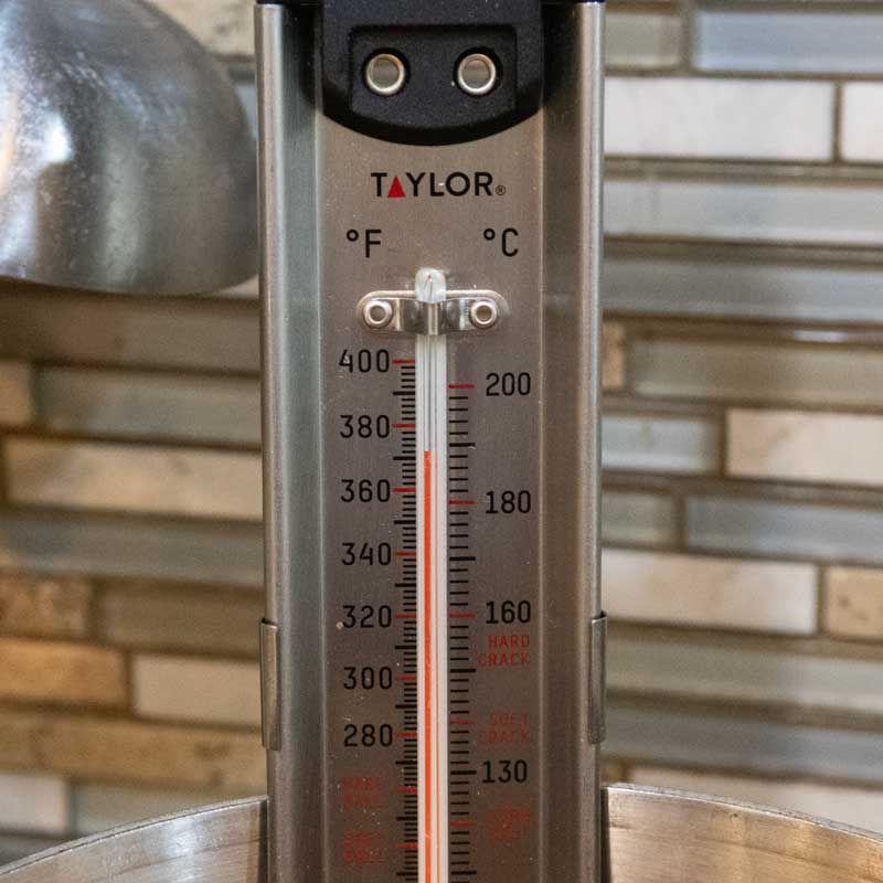 - Clip the candy thermometer to the back side of the pot, making sure that the bottom does not touch the bottom of the pot.