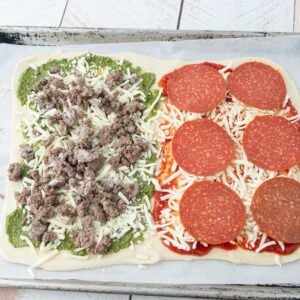 - Spread your dough with about 1/4 cup of your sauce of choice. If you want to make 2 flavors of pizza on the same sheet of dough, divide the sauce amount between the two. Here I used 2 tablespoons of pesto and 2 tablespoons of pizza sauce.