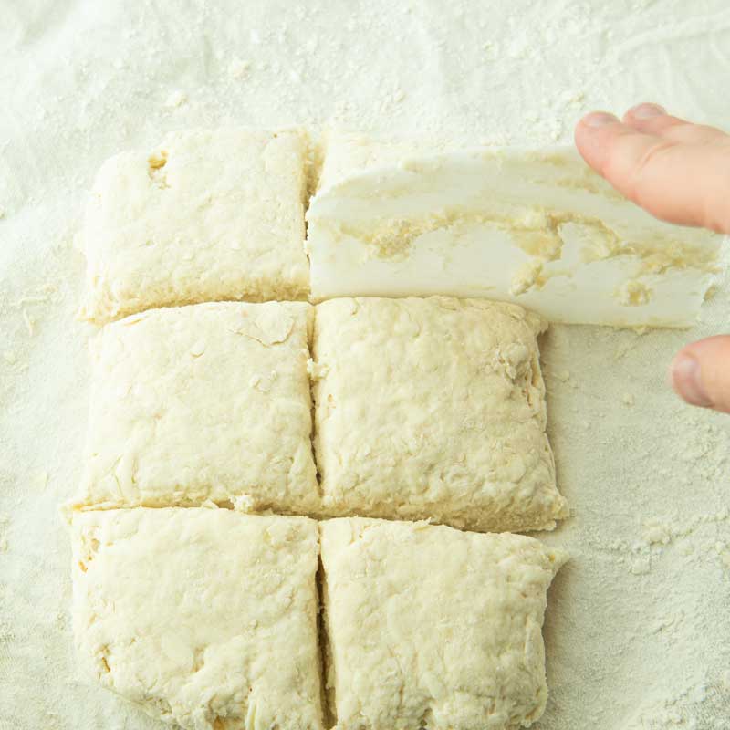- Cut them square: I know a lot of people love round biscuits. If you do, make sure you press straight down to cut through the dough. If you twist the cutter at all, it will seal the edges, so the biscuits will not rise as high in the oven. I prefer square biscuits as you won’t have to reroll anything.