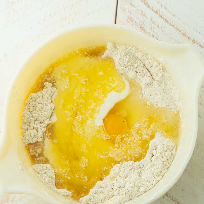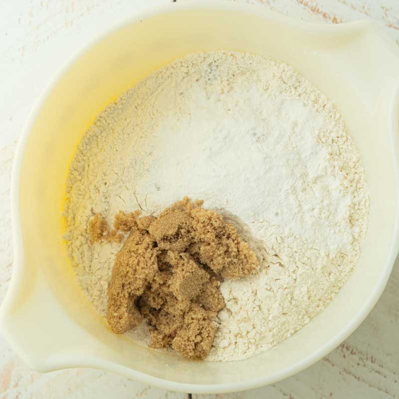 - Mix the dry ingredients: Mix the flour, brown sugar, baking powder, cardamom, and salt, in a bowl. Make a well in the middle of the dry ingredients.