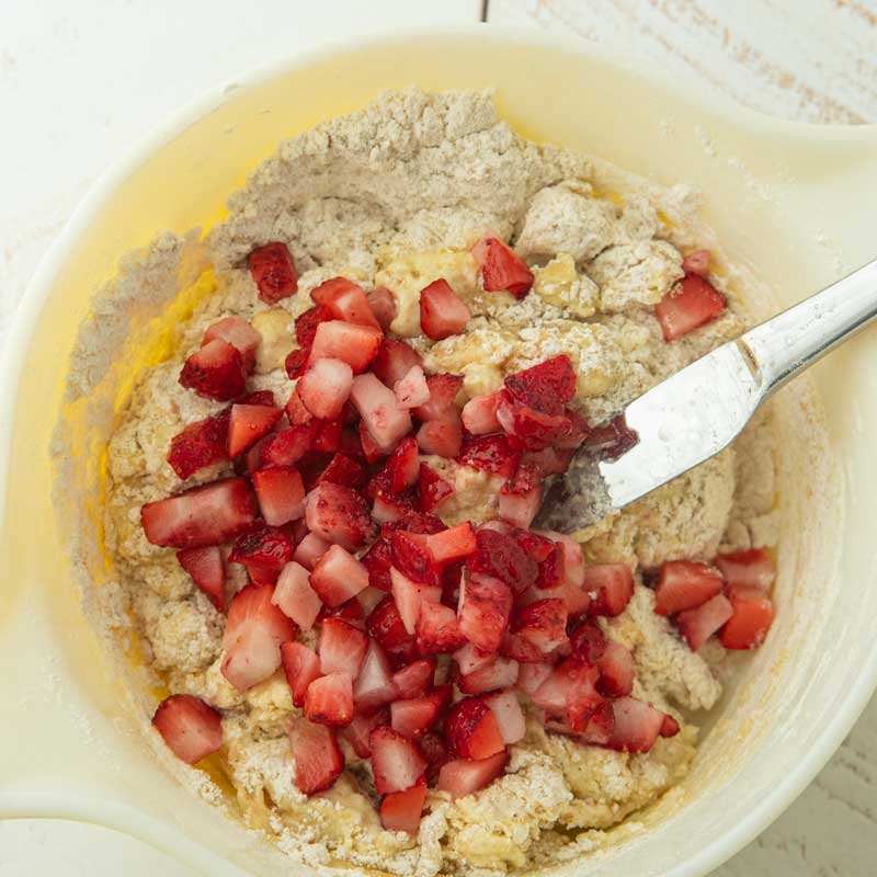 - Add the wet ingredients: Pour the buttermilk, butter, and vanilla into the well. Crack in the egg and whisk it lightly to break up the egg. Gradually, stir the flour into the wet ingredients to create a thick batter. Fold the chopped up berries into the batter.