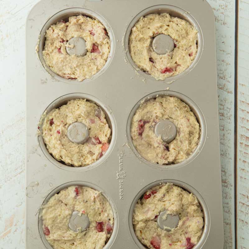 - Use a small cookie scoop to scoop 2 scoops of batter into each well of your pans. Drop the batter into the edges of each well, and then use lightly damp hands to press the dough into the pan.