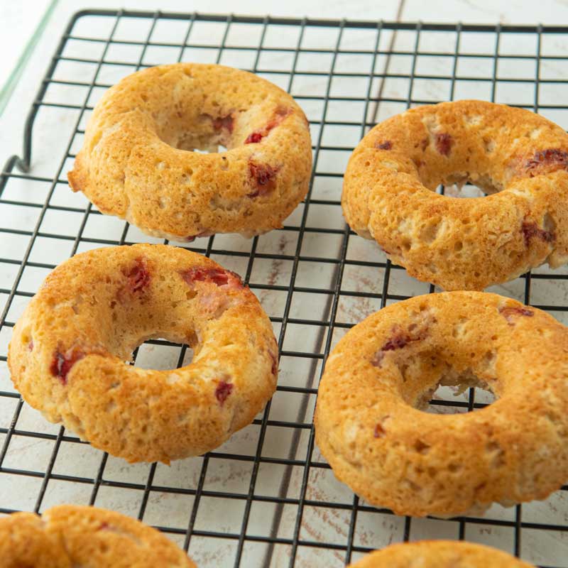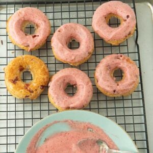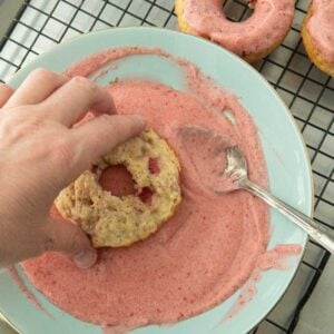 - Glaze when warm: Because these donuts are baked and not fried, they will be a little drier than a fried donut. That’s no problem here because if you glaze the donuts while they’re still warm, the added strawberry juices and butter will sink into the donut making for a lovely moist donut.