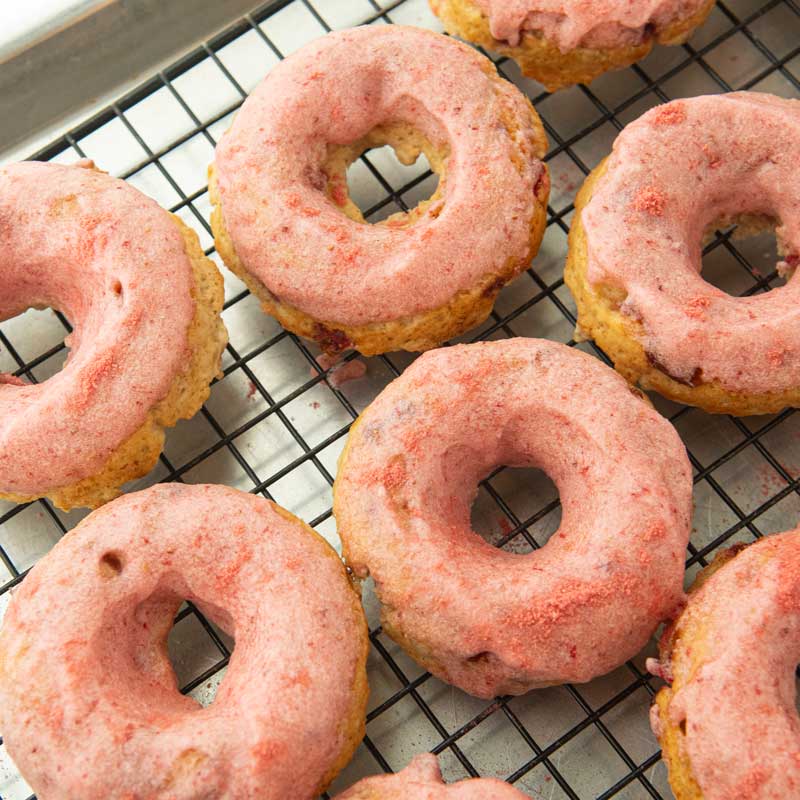 - Pour the glaze into a small bowl. Dip the tops of the donuts into the glaze. If you’d like, you can sprinkle on some freeze dried strawberry powder over the tops of the donuts for extra decoration. Set the donuts to drain and for the glaze to set on the wire rack.
