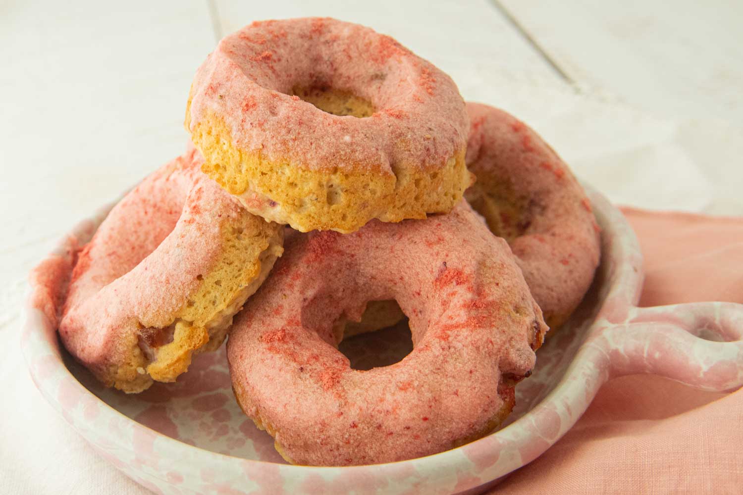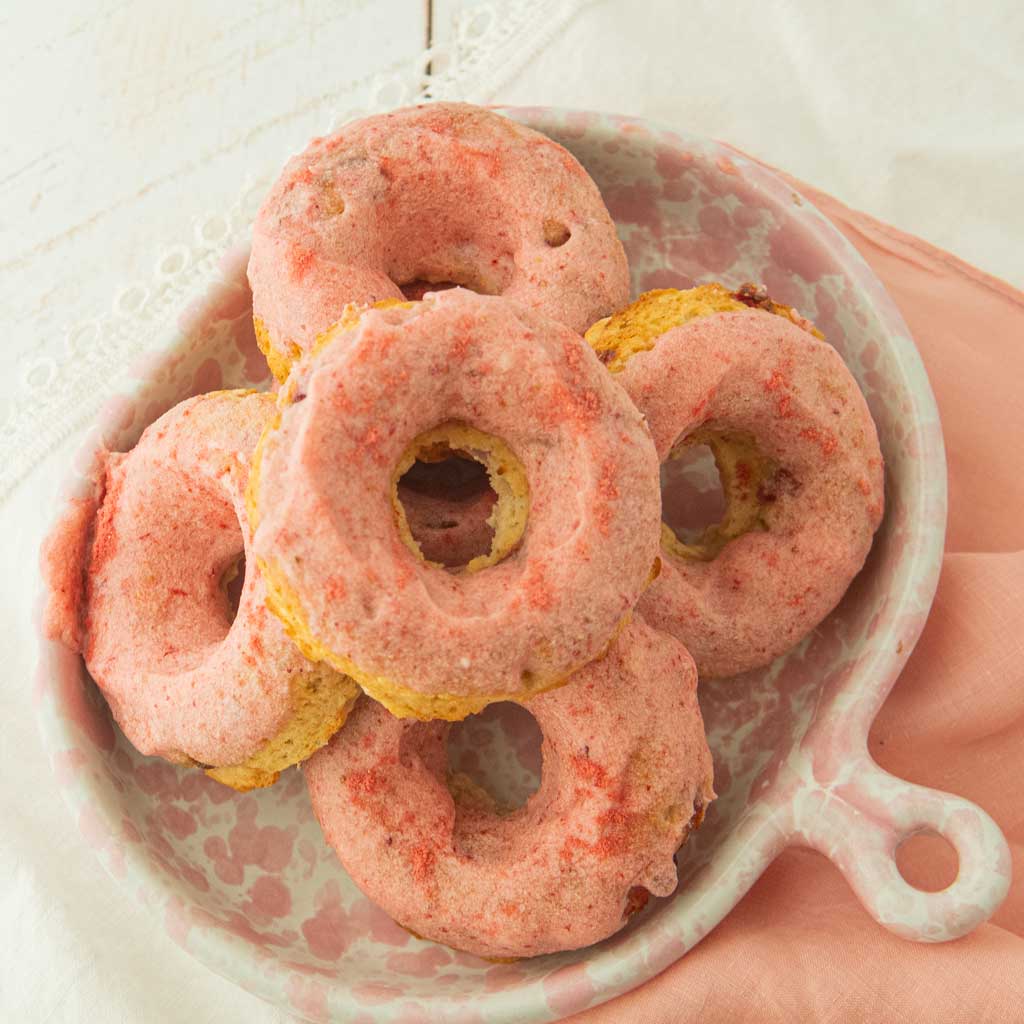 - Glaze: Pour the glaze into a small bowl. Dip the tops of the donuts into the glaze. If you’d like, you can sprinkle on some freeze dried strawberry powder over the tops of the donuts for extra decoration. Set the donuts to drain and for the glaze to set on the wire rack.